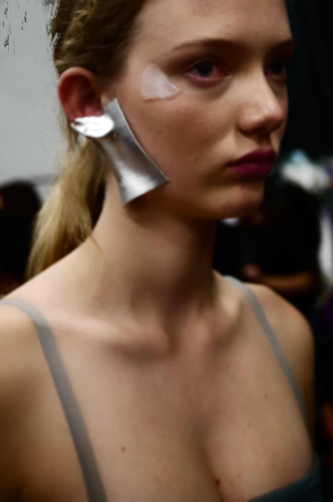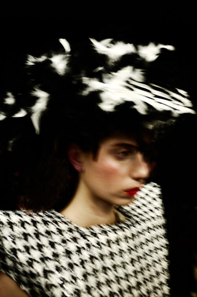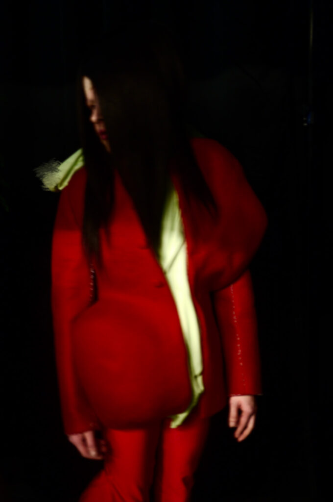 For the pieces themselves, I first built all the volumes in tape and newspaper, then reconstructed them in plaster, because to deform shapes this way you need to fix the material completely. All the forms were made in plaster, then translated into garments that mix tailoring, craft and millinery details.”