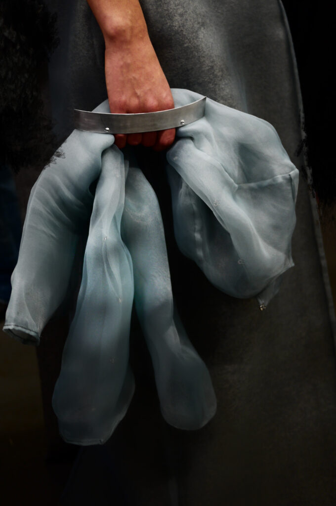 “I work with tape because my mother works in film, and she always came home from set with bits of tape stuck to her clothes. I wanted to bring that material into my practice. I use it to create spontaneous blur and draping, and in the collection every taped area becomes a silk satin insert. It turns into a luxurious detail that gives value to the garment and also connects pieces to one another.