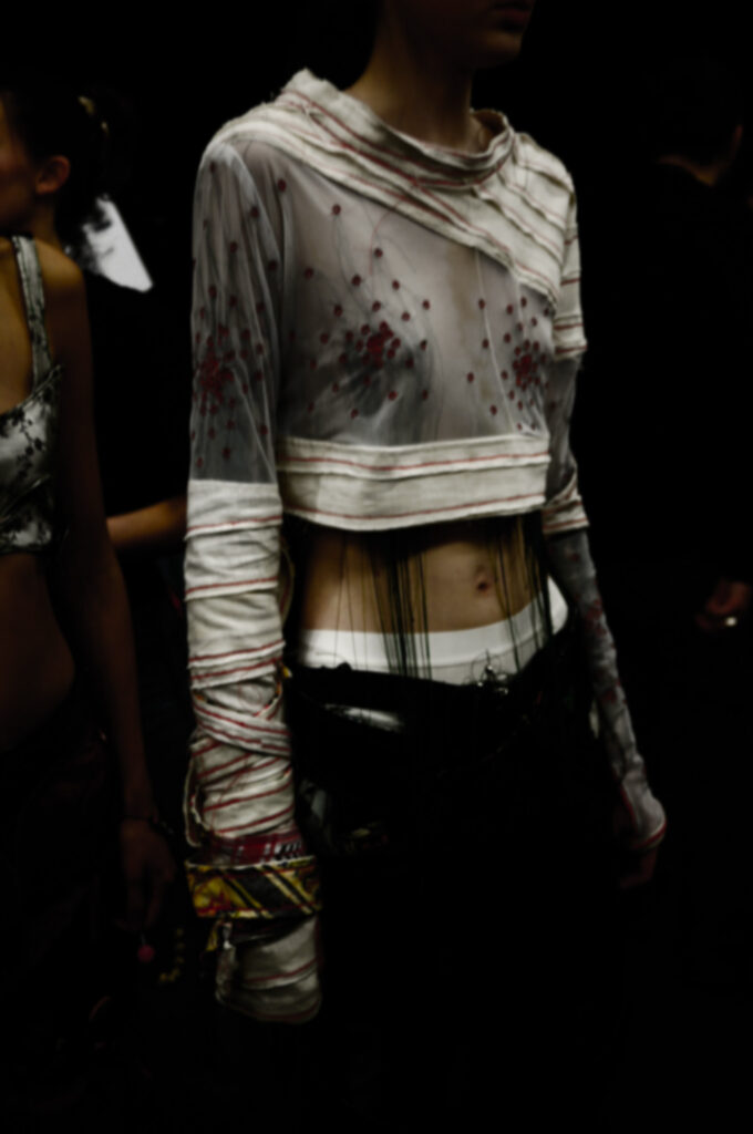 As for the gesture itself, I don’t know yet how it will evolve. Tape pushed me to develop a whole line of taped pieces, but now that I’m in the Master I want to explore other parts of my identity too. I still make taped T-shirts on the side because people respond to them, and I’m happy they exist. But in my personal practice I’m focusing more on who I am, working on prints, accessories, embellishment, things I didn’t explore as much in the collection because many pieces were defined by the upcycled garments I started from. This year I’m putting tape aside to concentrate on my own choices in cut and decoration, but it could very well return later in a more extreme, more evening-driven way. The concept has endless variations.
