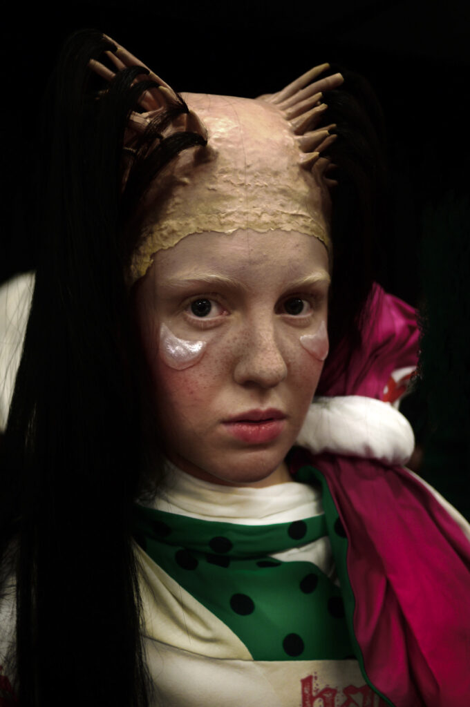 The wigs were made by Tommy and Noeh ( @provided_unfits) in Brussels. I wanted the deformations to run from head to toe, and they created ten handmade wigs that push this idea further, exaggerating details people usually find unattractive, like thinning hair. The shoes come from my own bunions. I amplified that deformation to create something striking and elegant.