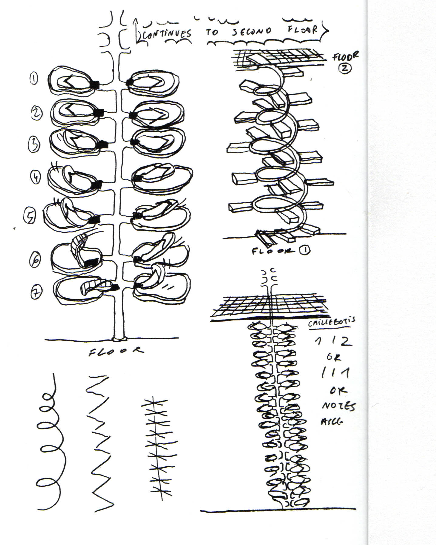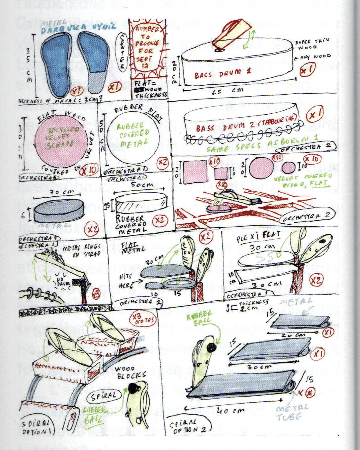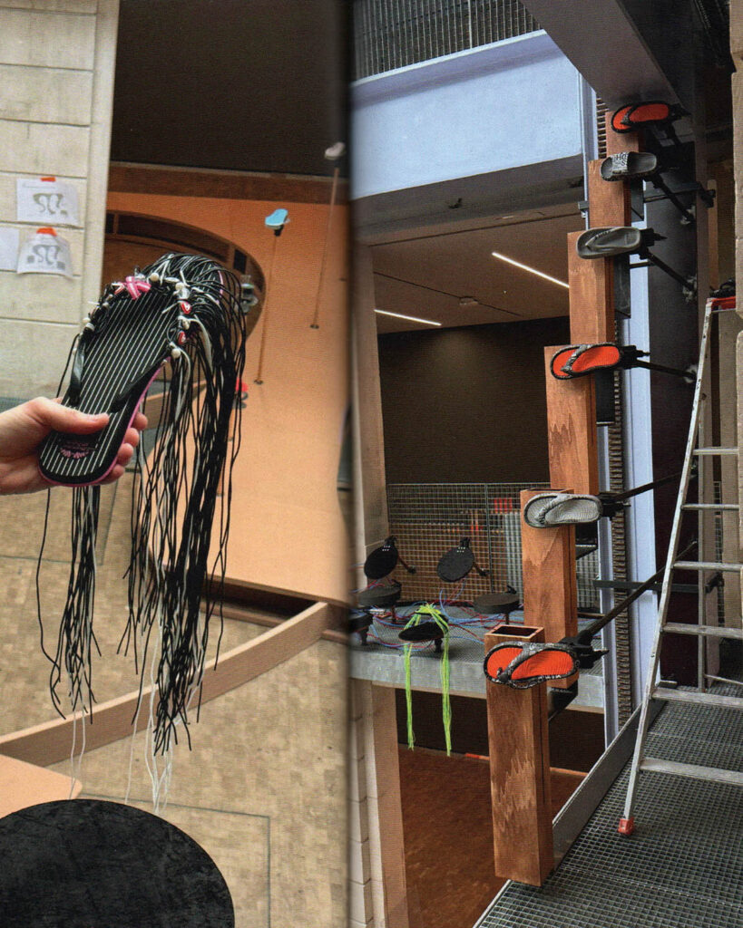 When we finalise the timbre of the instruments, the length of the tubes, the materials, which flip-flops to use, we do that together. The core of the installation is already there, but it’s with him that we really choose the sounds.