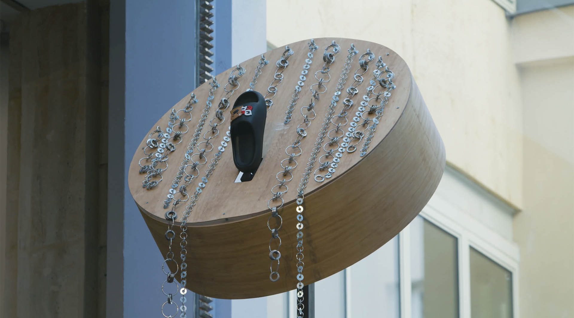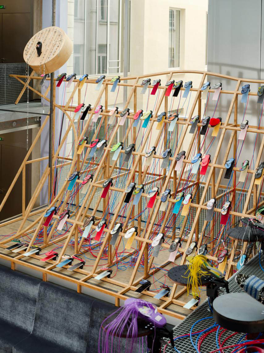 For her solo exhibition at Lafayette Anticipations, Moroccan-born, New York–based artist Meriem Bennani presents a monumental sound installation that turns the foundation into a vast acoustic instrument. Spanning the full height of the building, Sole crushing gathers nearly 200 flip-flops and sandals mounted on a pneumatic system and arranged with precision. These shoes strike different surfaces, producing percussive sounds that evoke crowds, protests, stadium chants or the Moroccan dakka marrakchia.