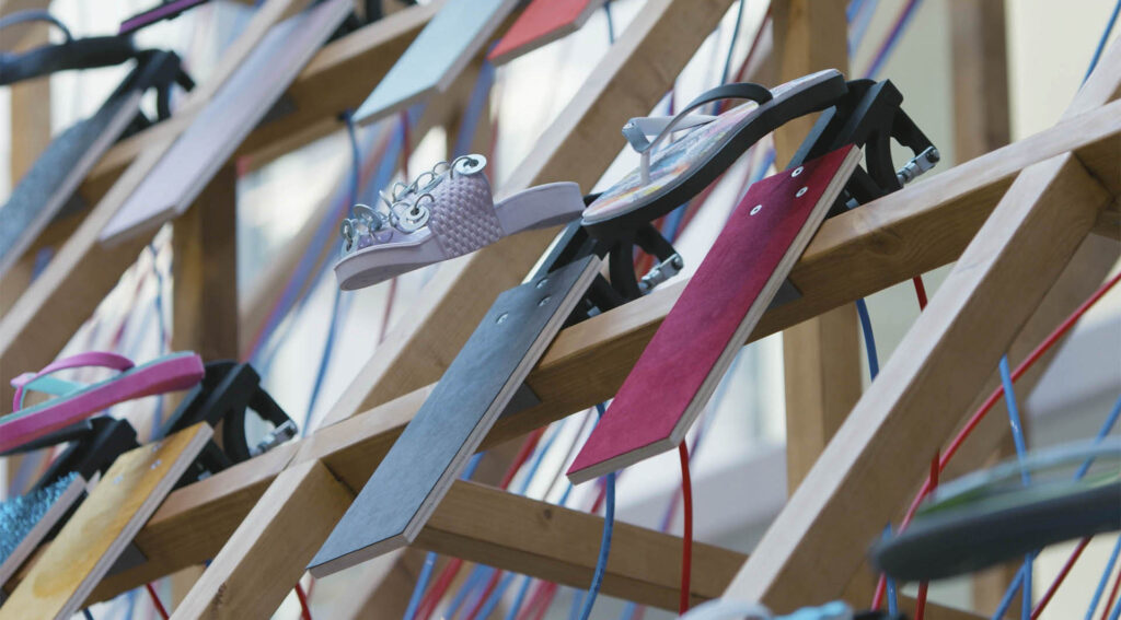 Yes. The soles produce different tones. Sometimes we add rings to create a shaker effect. Reda and I had shared videos of people making music with flip-flops and bamboo. A flip-flop is such a simple object that it gets reused for many things. We wanted an additional instrument that would give us more melodic notes, not only percussive ones.